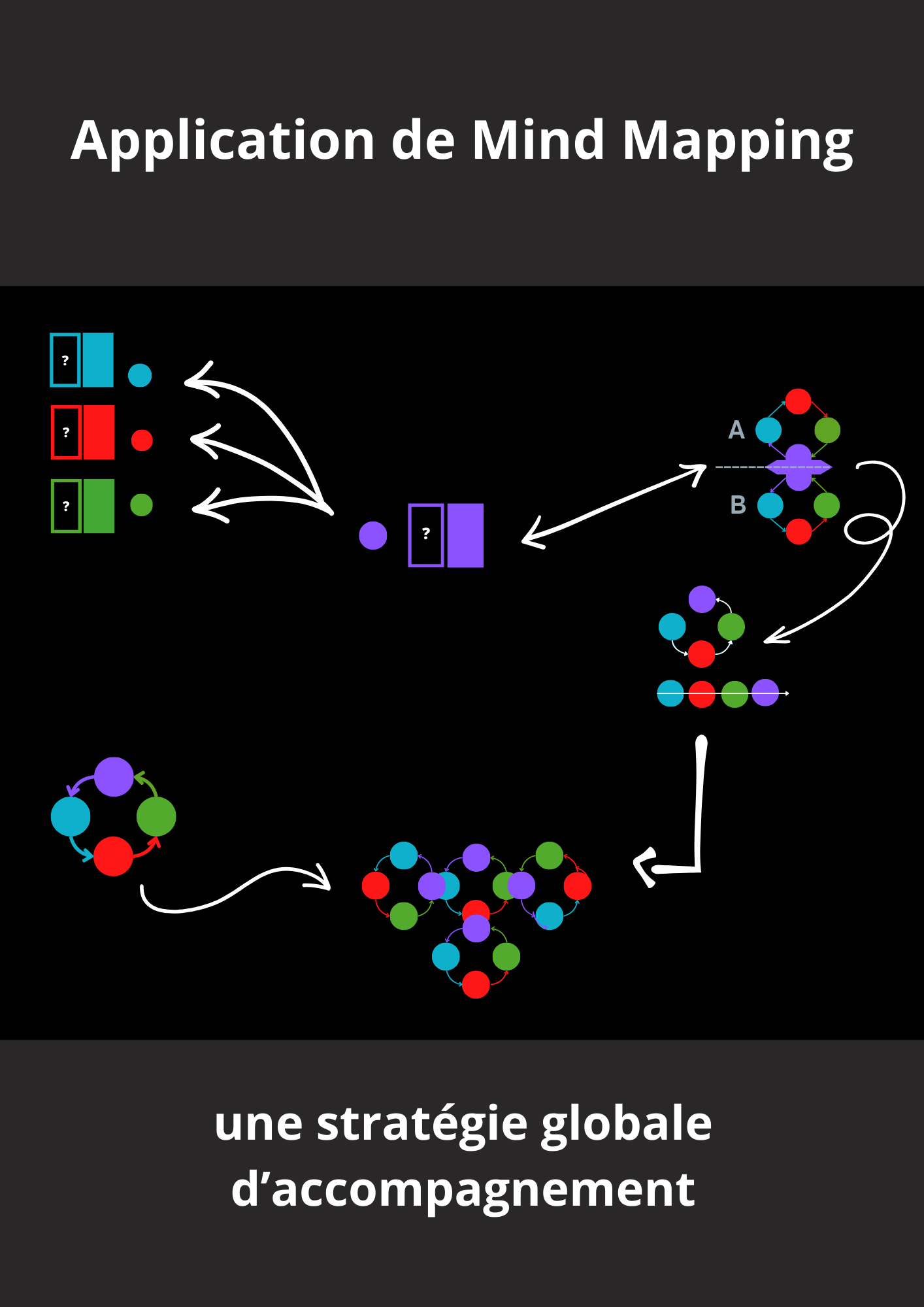 A partir du thème central, les participants sont accompagnés à écrire toutes les informations qui s’imposent spontanément à eux, qu’elles soient expérientielles ou conceptuelles, présentes ou passées, et laisser leur pensée se développer en arborescence en créant des liens entre chaque information.